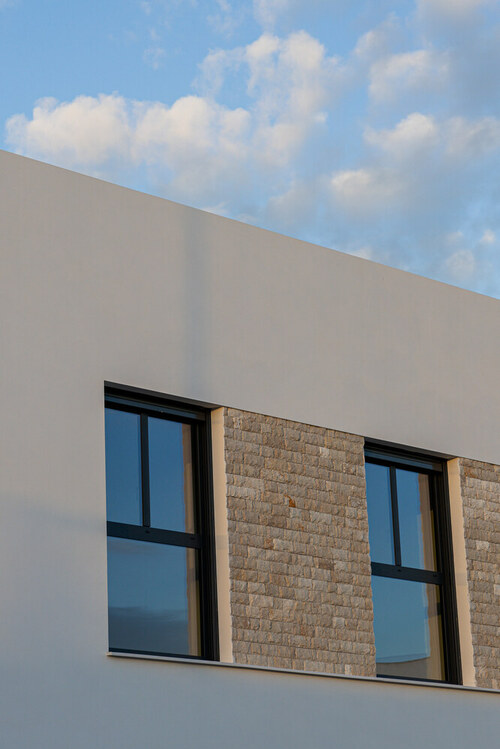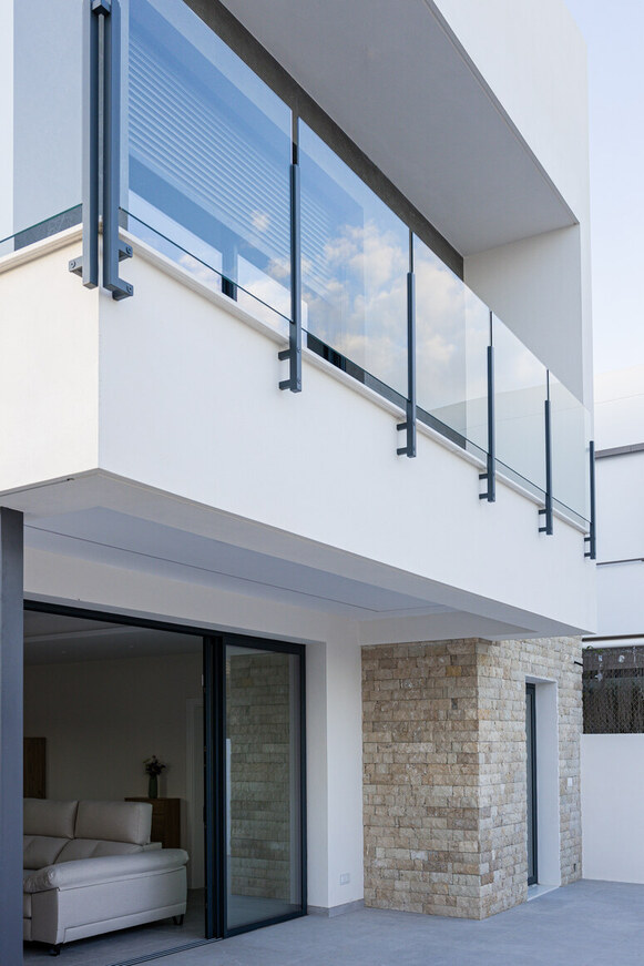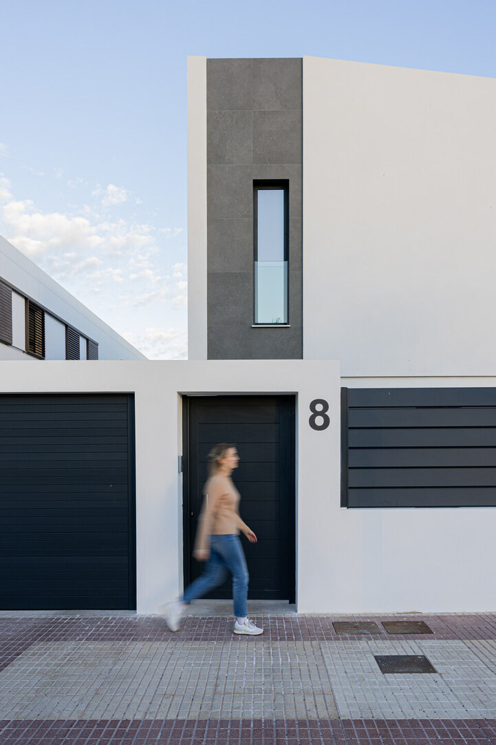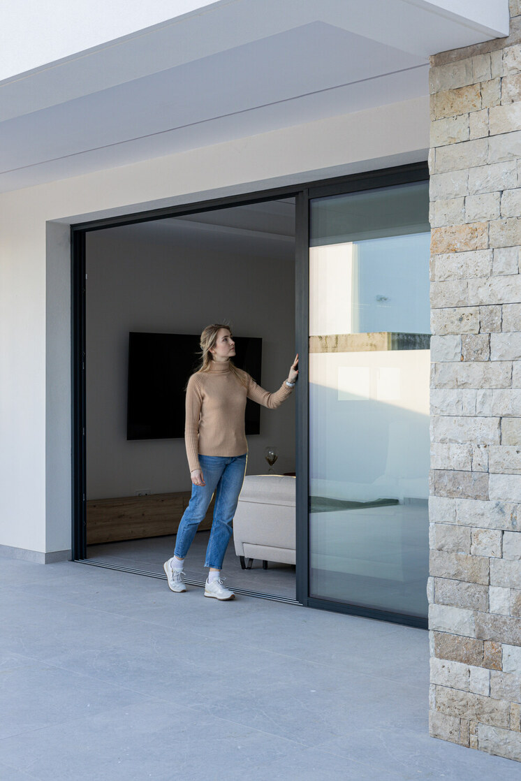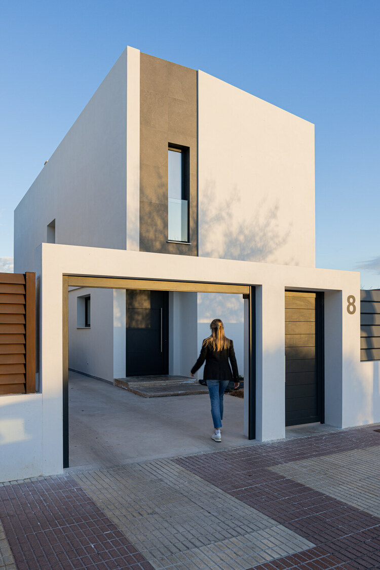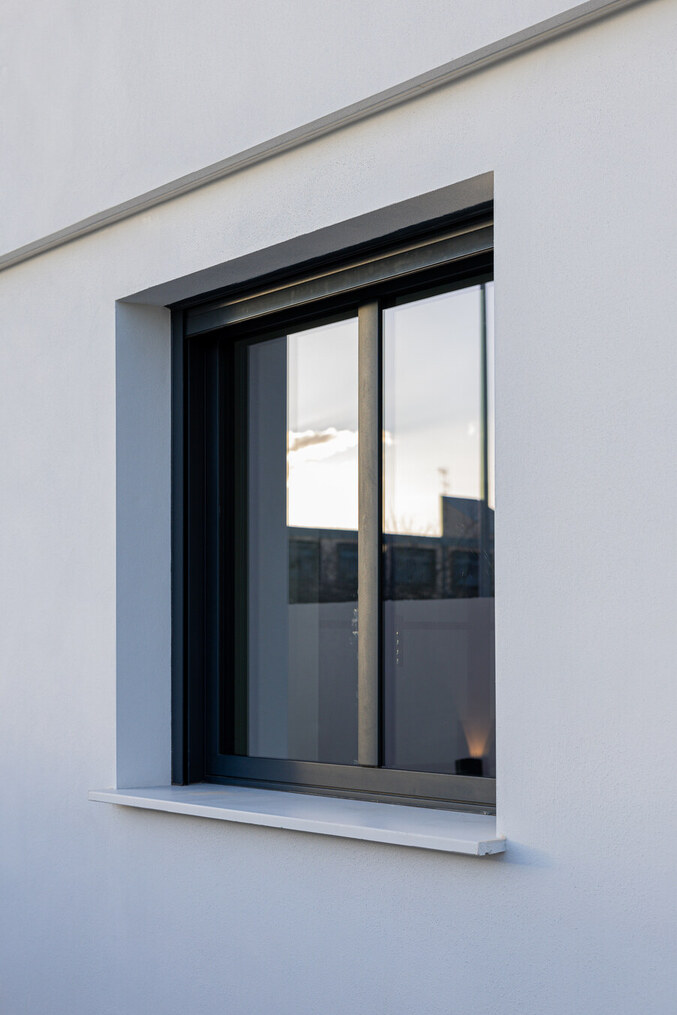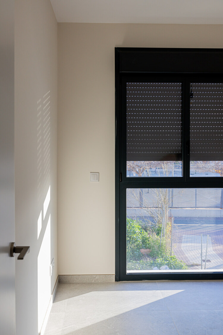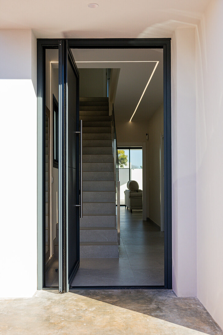Vivienda unifamiliar de diseño minimalista donde la carpintería de aluminio se convierte en un elemento arquitectónico protagonista. Puerta pivotante, ventanas correderas y practicables, junto con una puerta interior separadora de ambientes, conforman un conjunto coherente que combina estética depurada y máxima funcionalidad.