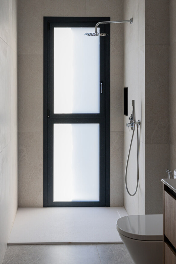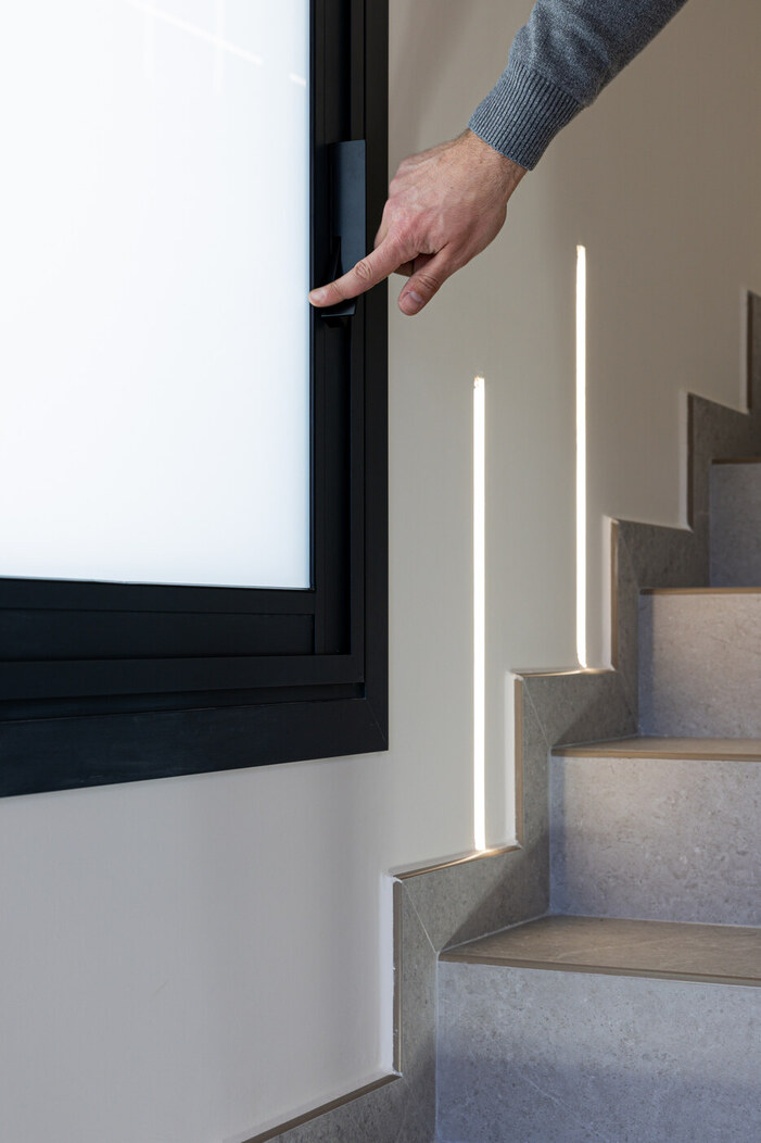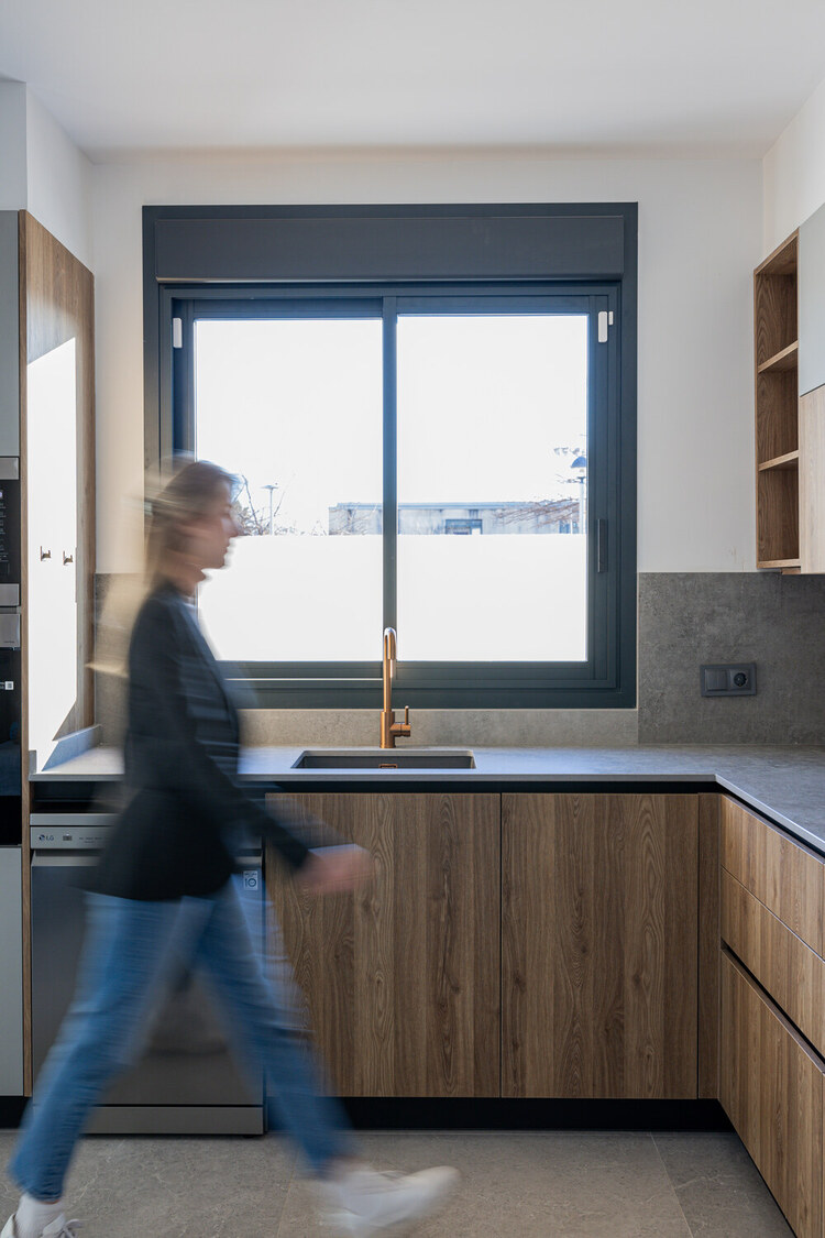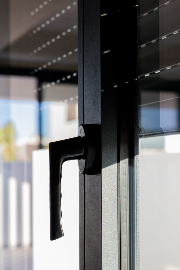 La entrada principal se resuelve con una imponente puerta pivotante de gran formato, que aporta carácter y continuidad visual con el resto de carpinterías en aluminio negro. En el interior, las ventanas practicables permiten una ventilación controlada y un óptimo aislamiento, mientras que las correderas de perfilería mínima ofrecen amplias aperturas hacia las zonas exteriores. La puerta interior de vidrio y aluminio separa estancias sin interrumpir la luz natural, aportando versatilidad al uso de los espacios.
