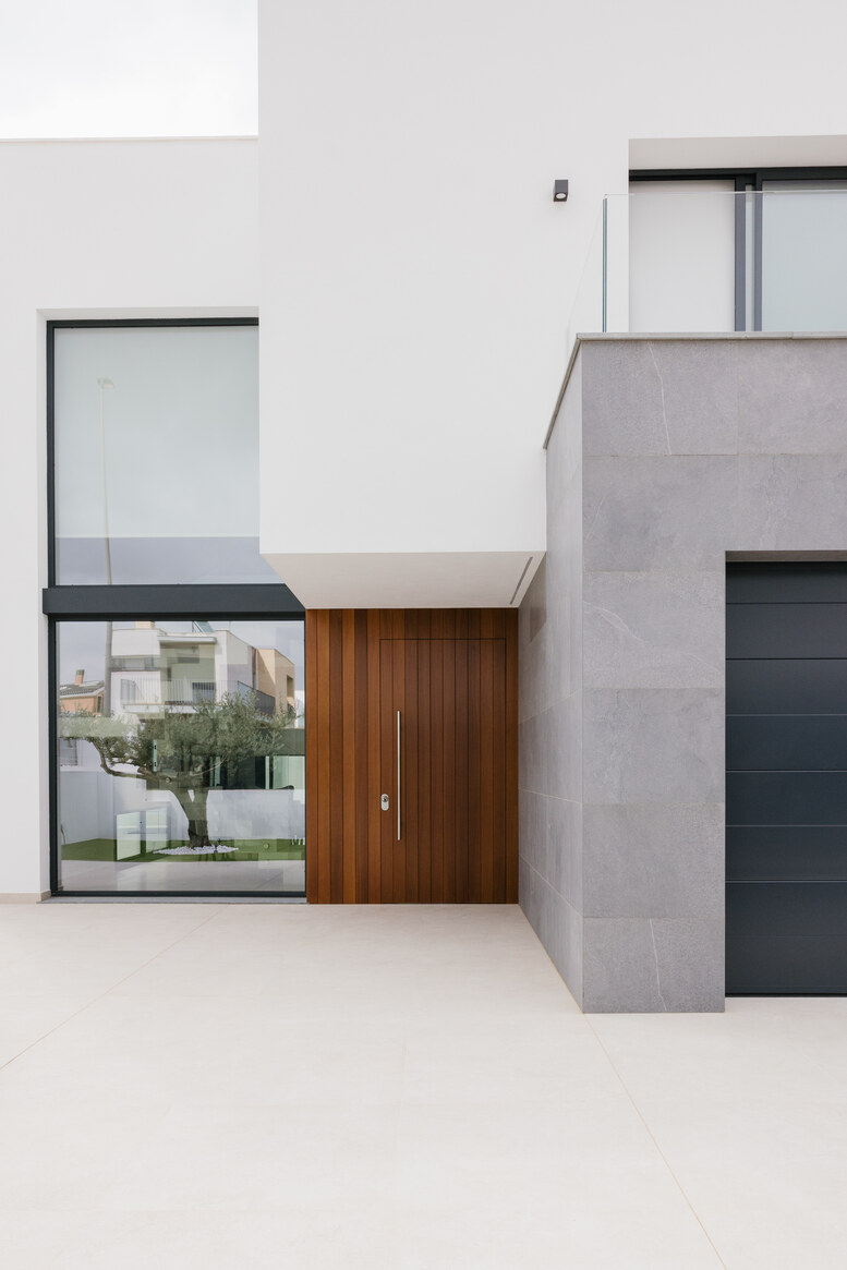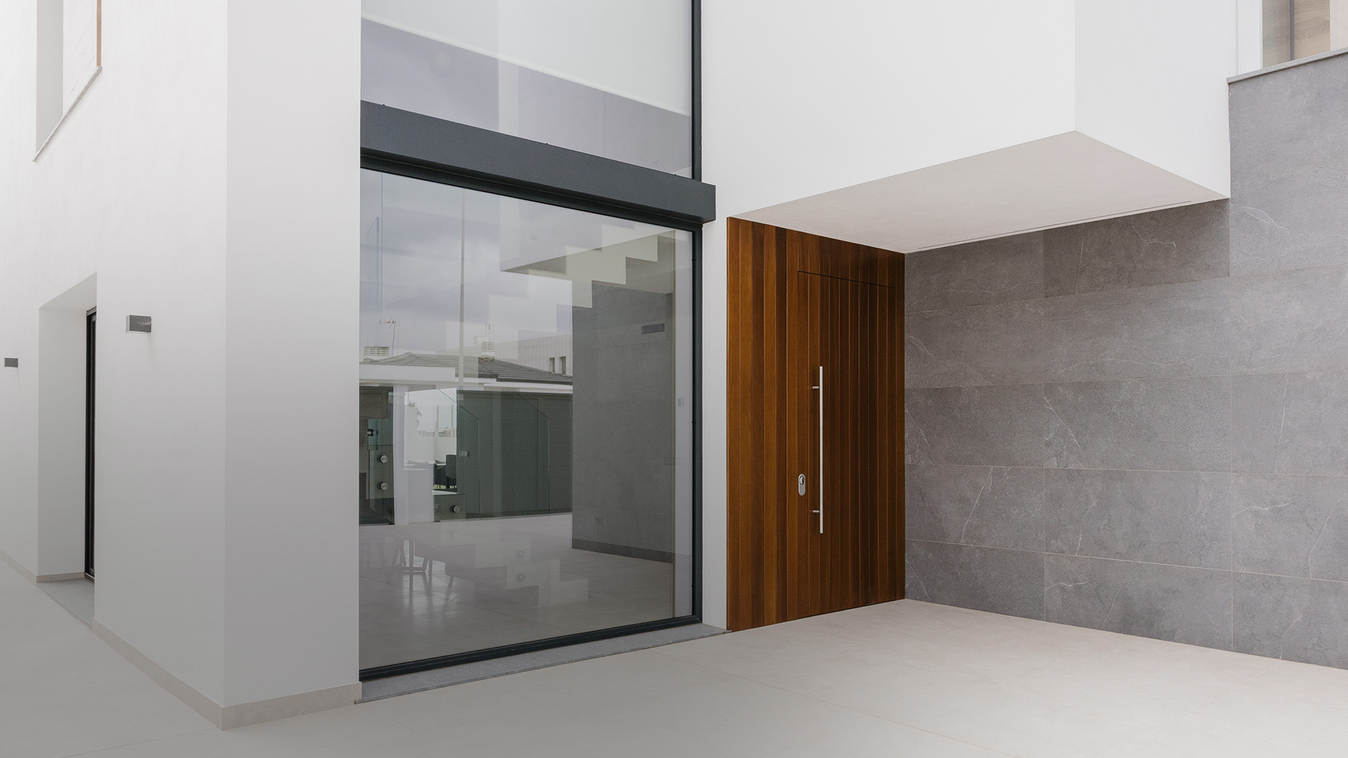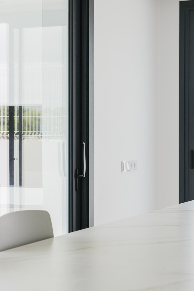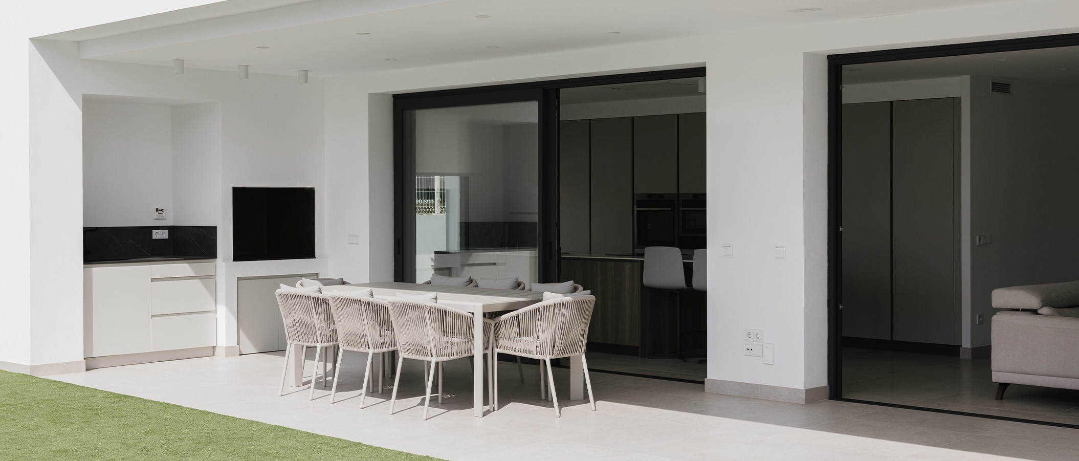 Esta vivienda de líneas puras y volúmenes contundentes integra carpinterías de aluminio minimalistas que maximizan la superficie acristalada y potencian la conexión visual con el exterior. La precisión técnica y el cuidado estético se unen para lograr aperturas amplias, seguras y altamente eficientes, creando en cada estancia una sensación de amplitud, confort y exclusividad.