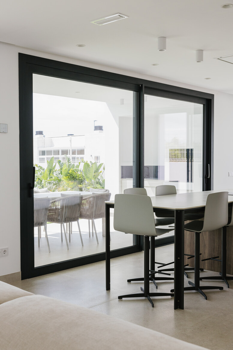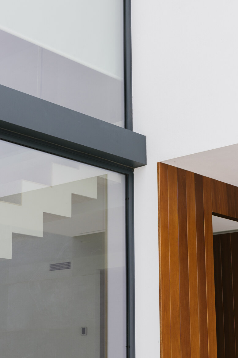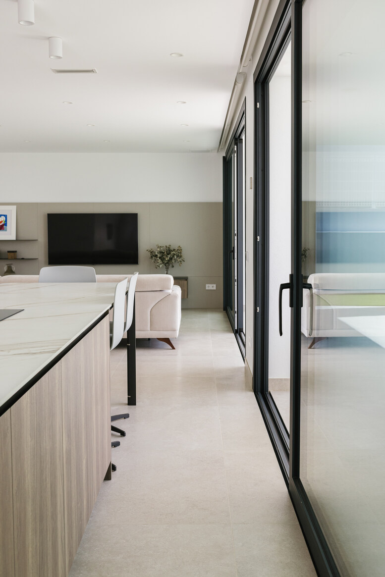 El proyecto combina ventanas abatibles y practicables oscilobatientes con hoja oculta, permitiendo mayor proporción de vidrio y marcos reducidos, siempre con forraje perimetral y vidrios con control solar y de seguridad. Las correderas, con nudo central reducido de 40 mm, drenajes ocultos y maneta minimalista, incorporan un sistema de goma en “U” que evita el contacto directo entre vidrio y aluminio, minimizando la transmitancia térmica. Además, se han instalado fijos junto a la puerta pivotante, y dos ventanas elevables enrasadas al suelo con cierres multipunto, vidrio de alta seguridad y control solar, que al descender sellan con precisión para una estanqueidad y hermeticidad máximas.