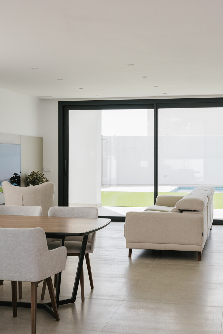 Cada apertura ha sido diseñada para ofrecer una experiencia visual y funcional impecable. Las ventanas elevables enrasadas a suelo permiten transiciones sin barreras y, gracias a su sistema de sellado mediante gomas, alcanzan un alto nivel de confort térmico y acústico. En conjunto, la carpintería se integra como un elemento arquitectónico esencial, fusionando estética y rendimiento.
