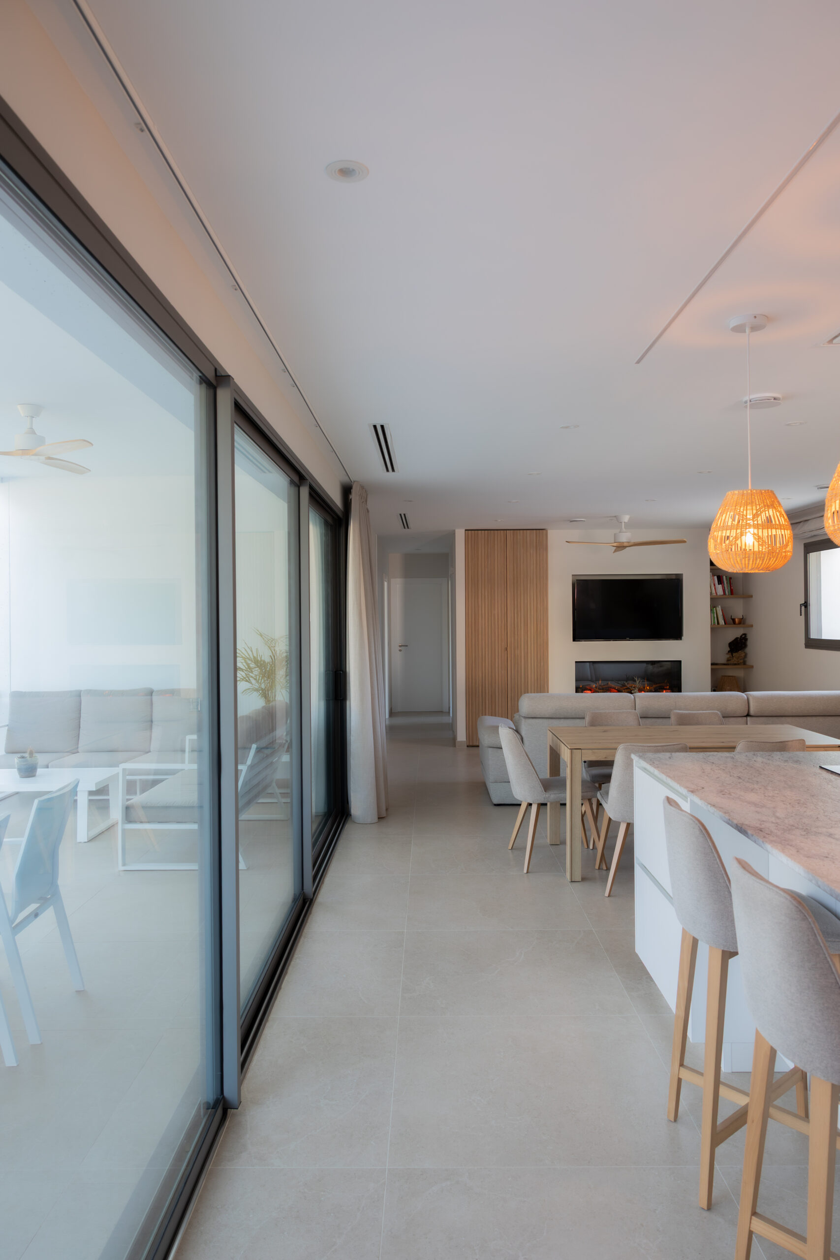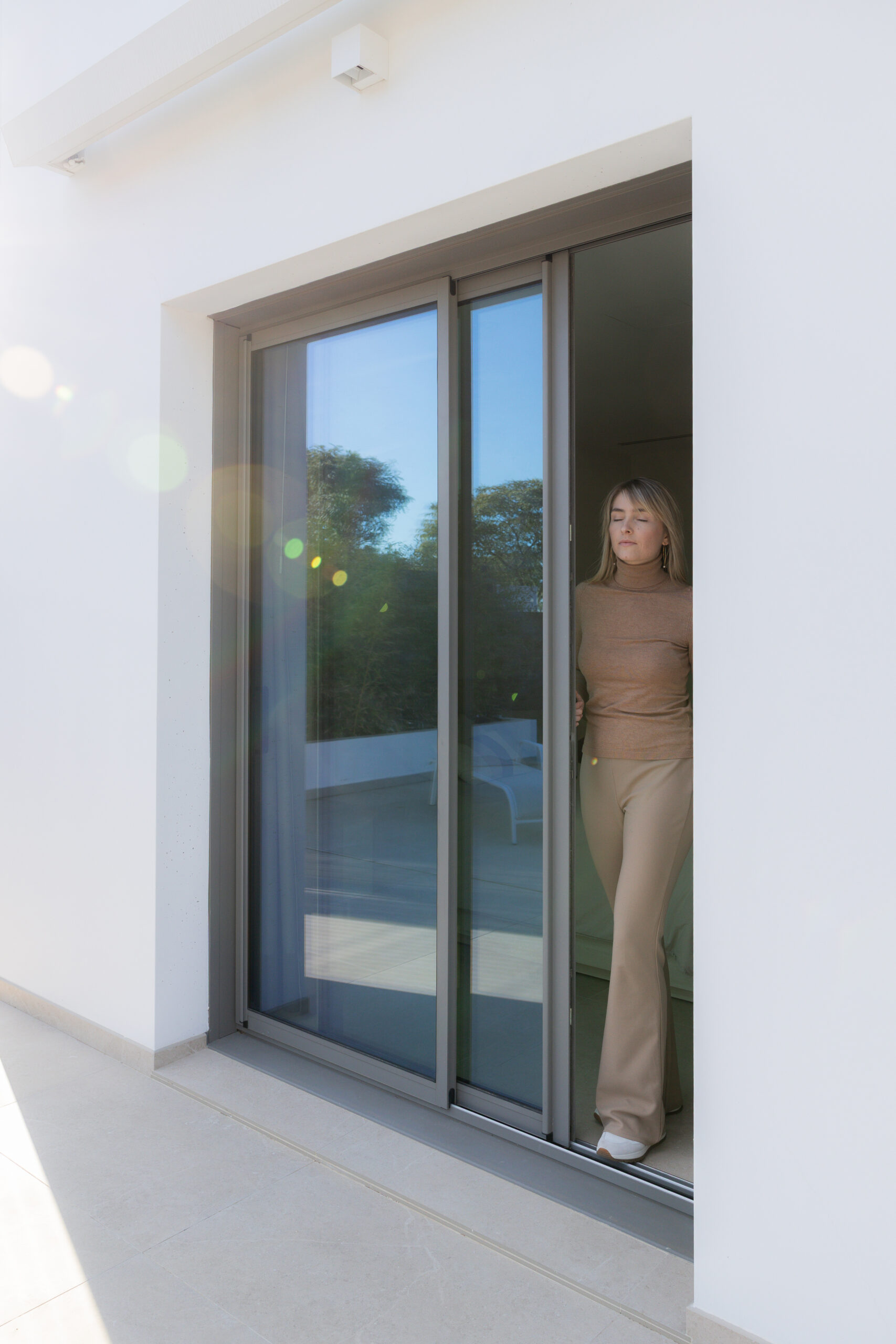 Esta solución nos permite tener un mayor espacio de paso, puesto que al tener tres hojas la ventana se esconde en el espacio de solo una hoja y da paso a la fluidez entre espacios. Además de la gran luminosidad que nos brindan sus dimensiones.