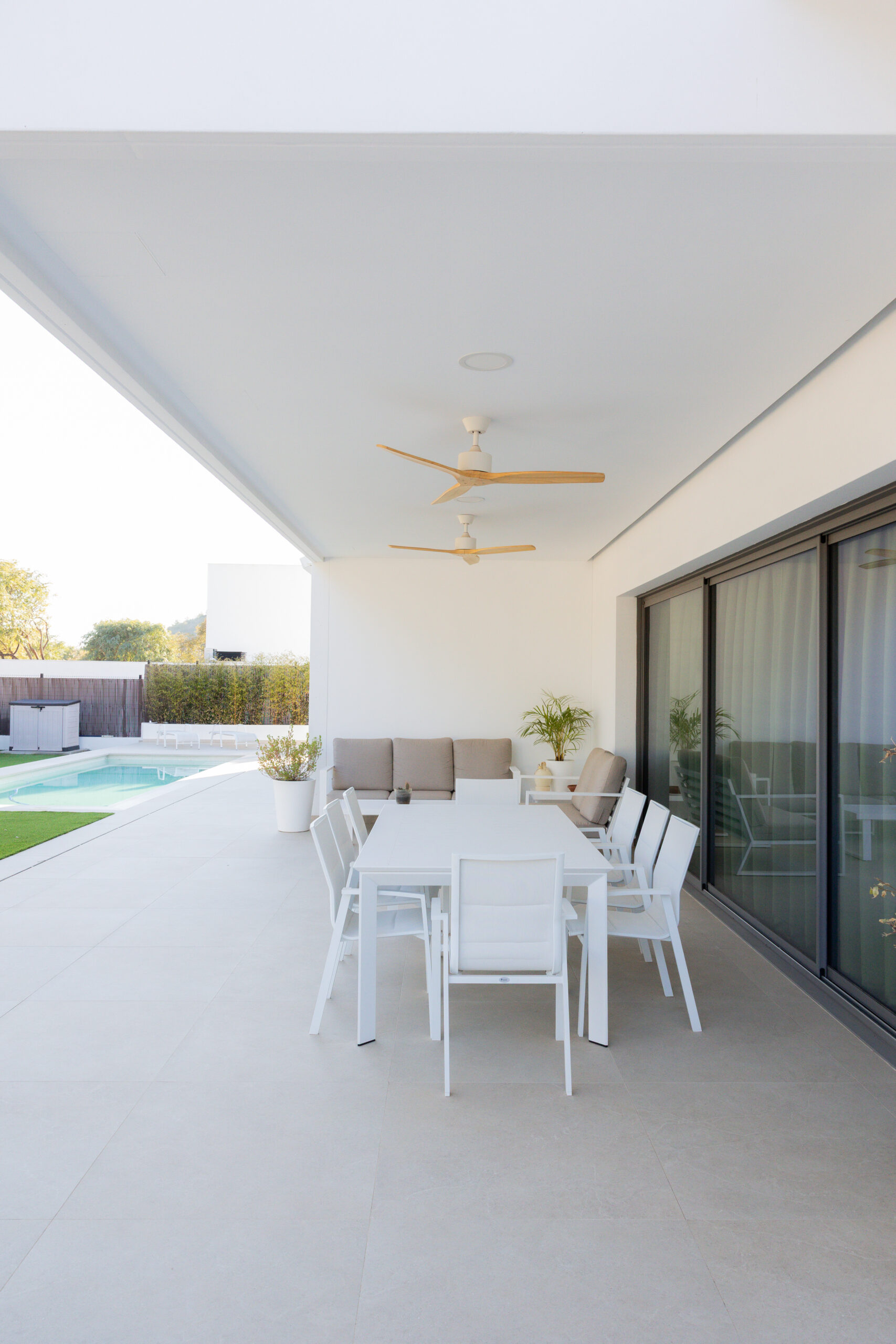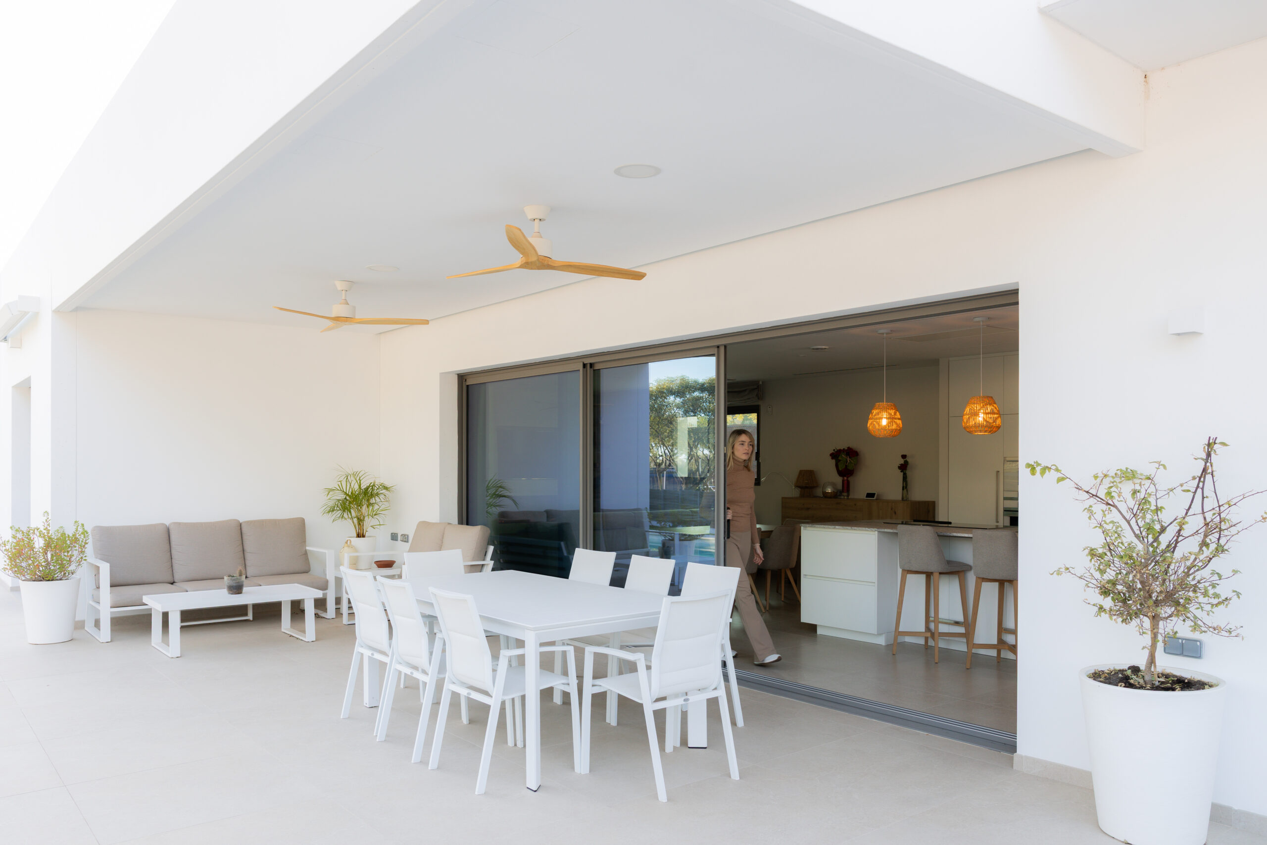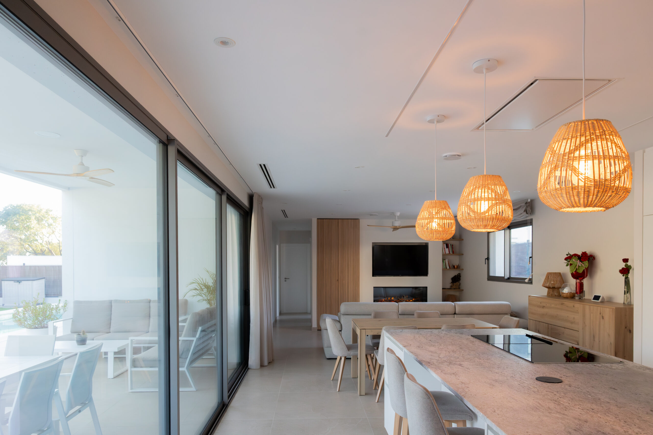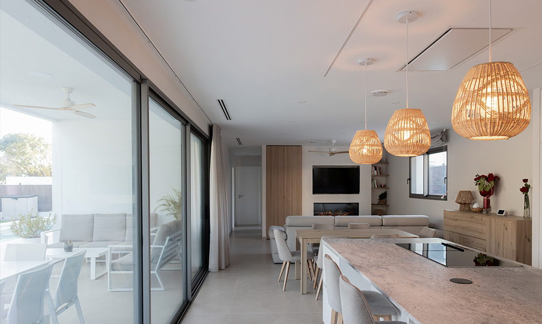 Esta búsqueda por la continuidad visual y espacial nos llevó a aconsejar al cliente a decantarse por una corredera de triple hoja con marco en bloque. Este producto se convierte en el alma de la casa puesto que todo sucede ahí, tanto en invierno como verano, sus dimensiones de 6000x2700mm, eliminan las barreras espaciales.