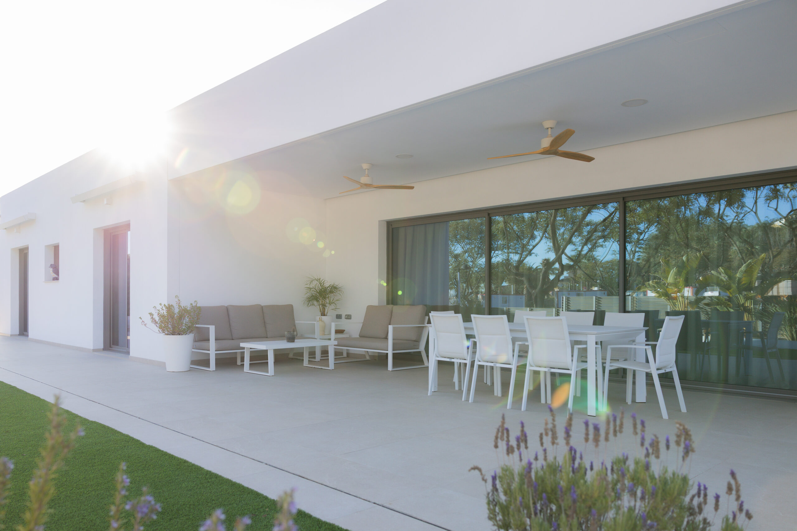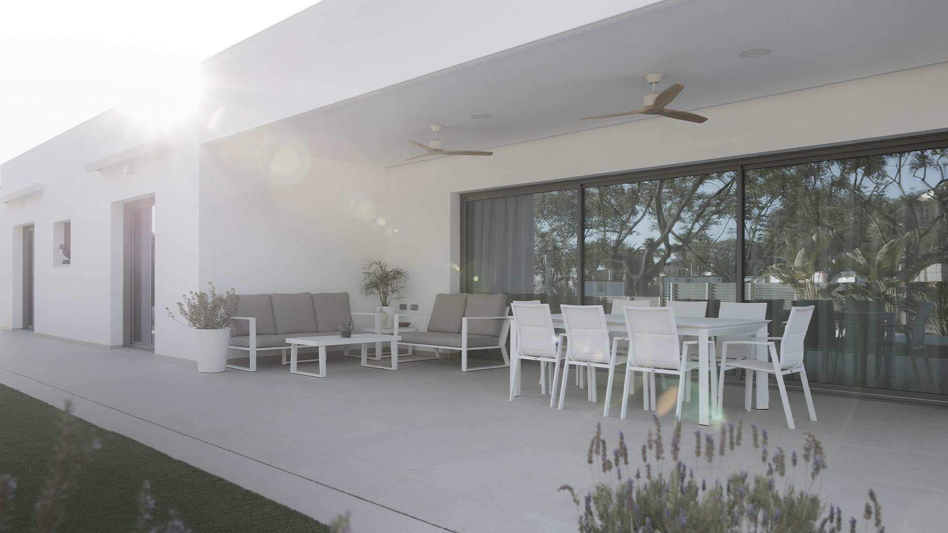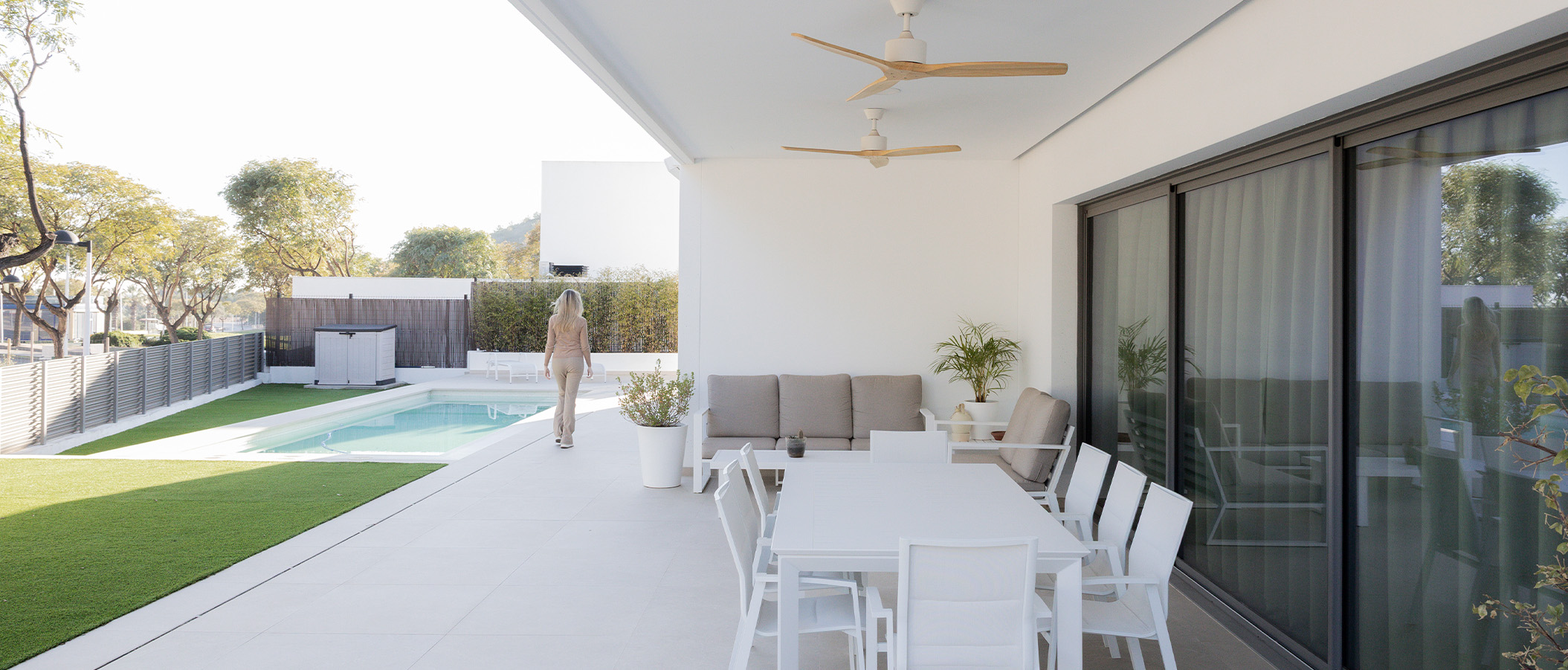Esta búsqueda por la continuidad visual y espacial nos llevó a aconsejar al cliente a decantarse por una corredera de triple hoja con marco en bloque. Este producto se convierte en el alma de la casa puesto que todo sucede ahí, tanto en invierno como verano, sus dimensiones de 6000x2700mm, eliminan las barreras espaciales.